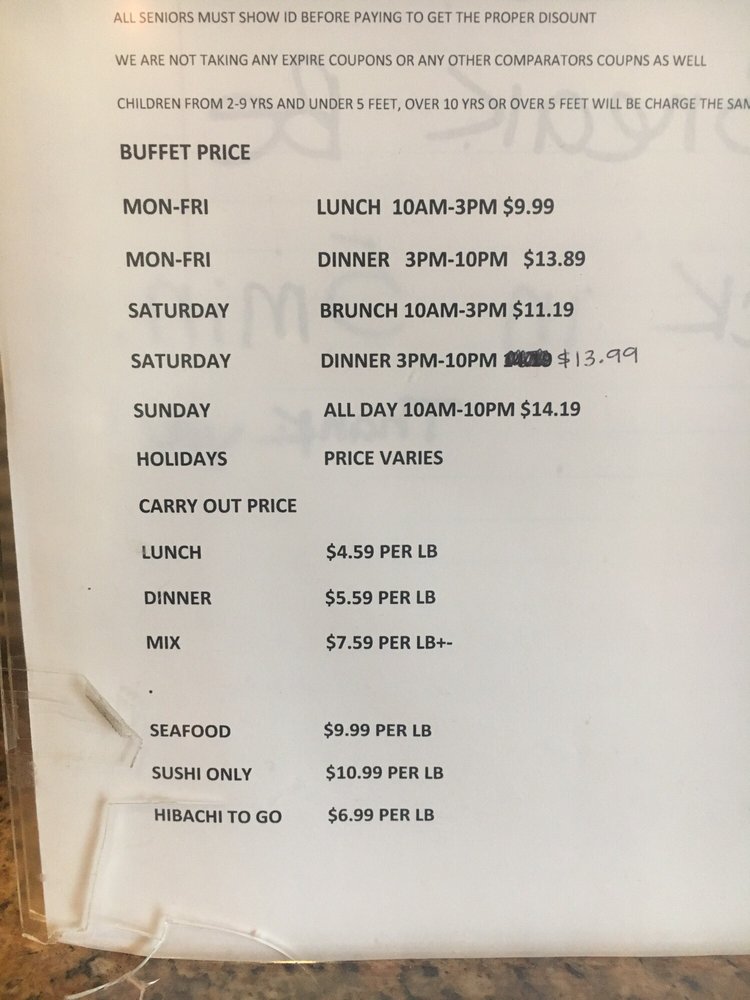 “ Prices of the buffet , includes Hibachi grill , sushi , Chinese buffet and the drinks. ”